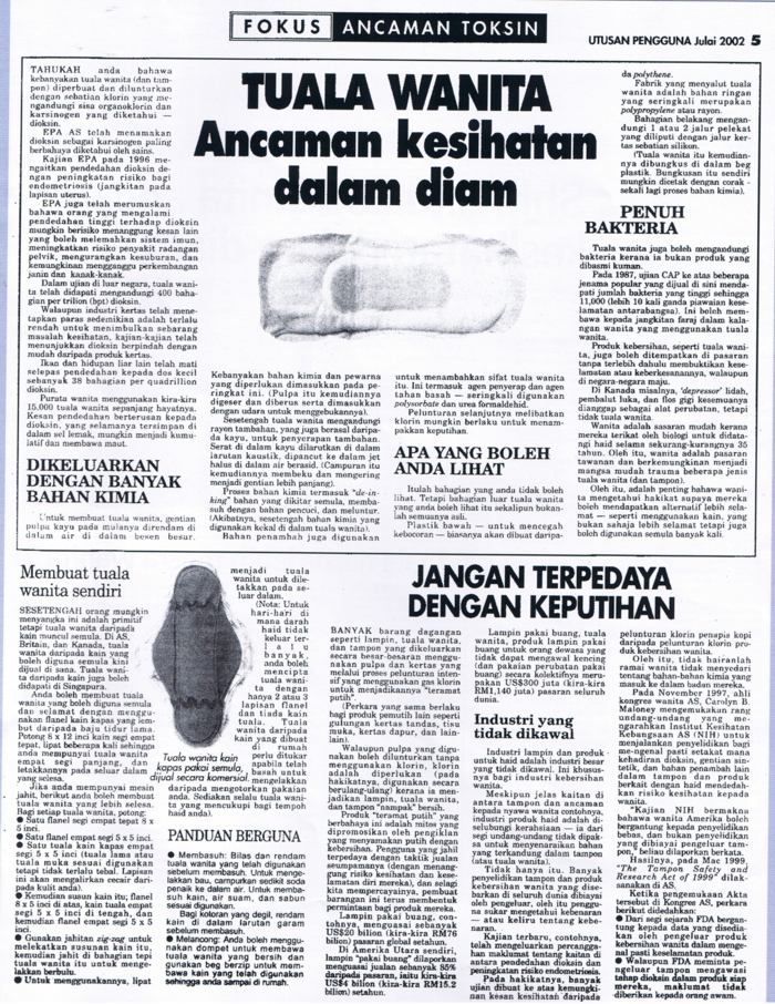 Tahukah anda, tuala wanita serbuk kayu pulpa, kotak, kertas terbuang yang dilembutkan dan diputihkan melalui proses pelunturan dengan bahan peluntur yang berklorin yang menghasilkan bahan kimia iaitu DIOKSIN.